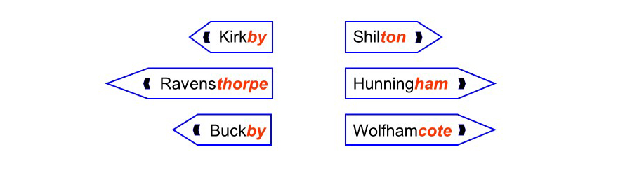 In the instances we have just looked at, the point of interest was what the place-names explicitly meant (even if those meanings had become slightly disguised). But, quite apart from what it may actually mean — and it will always mean something — a place-name also gives out all sorts of other signals. These are encoded in its spelling, in its local pronunciation, and even in the question of what language it is in; and these matters can be decoded, again in much the same way that an archaeologist interprets the context of a physical artefact that has been dug up. For example, the network of Roman roads in Britain radiates out from London, which for communications purposes was already effectively the capital two thousand years ago. Until the era of the motorways, beginning in the 1960s, no new network of planned roads had ever been imposed, and these long, straight Roman highways, albeit tarmacadamed and maintained, still constituted the trunk infrastructure. One of them is the famous Watling Street, nowadays known more prosaically as the A5, running from London to Holyhead. Now, if you ever embark on the ferry at Dublin port (yes! come the day, that will again be permissible), get off the other side, and proceed by car towards London taking that same A5, look at the signposts as you pass through the midlands near Birmingham. You will notice that small towns and villages located to your left (that is, to the north-east of the road) typically have names such as Kirkby (or Kirby), Ravensthorpe and Buckby, while those to your right, or south-west, are called things like Shilton, Hunningham and Wolfhamcote. Never mind the meanings any more: these names are actually in different languages, seeing that the ‘‑thorpes’ and the ‘‑bys’ are Norse, and the ‘‑tons’, ‘‑hams’ and ‘‑cotes’ are Old English. Why that distribution? Well, it reflects the fact that for hundreds of years Watling Street was the agreed international frontier between the Danelaw, settled by the Vikings, and the Mercian region of England. The division ceased over a thousand years ago, but by then it had been etched permanently into what we might call the linguistic archaeology of the landscape. Even if all the direct, textual evidence for the Danelaw had been lost a linguist, looking at the map, might still spot the distribution of place-names, see that the different languages were involved, notice that the A5 seemed to be the dividing line, and hypothesise correctly that there had been some sort of agreed frontier running along it in the past.