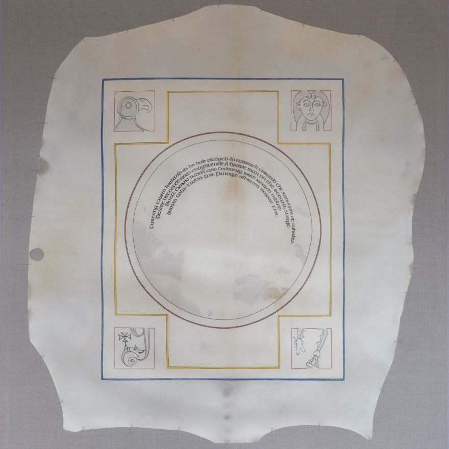 This artwork by master calligrapher Timothy O’Neill incorporates lines from an Early Irish poem in praise of Colum Cille where he is depicted on his journey between Ireland and Scotland, a reference to the story of the saint’s exile from Ireland. The circle marks his world and the shared traditions of communities on both sides of the Sea of Moyle. Produced on vellum (calfskin parchment) and mounted on linen, the artwork embodies aspects of the economy and material culture of the Columban era. The majuscule script harks back to the earliest Latin manuscripts and was always used for copying one of the most important early Columban texts, the eulogy Amrae Coluimb Chille. The artwork also references images from the most famous manuscripts associated with the saint, An Cathach, The Book of Durrow, The Book of Kells and the 16th century biography of Colum Cille by Maghnas Ó Domhnaill, Betha Colaim Chille, reflecting Colum Cille’s enduring influence on the scribal tradition.