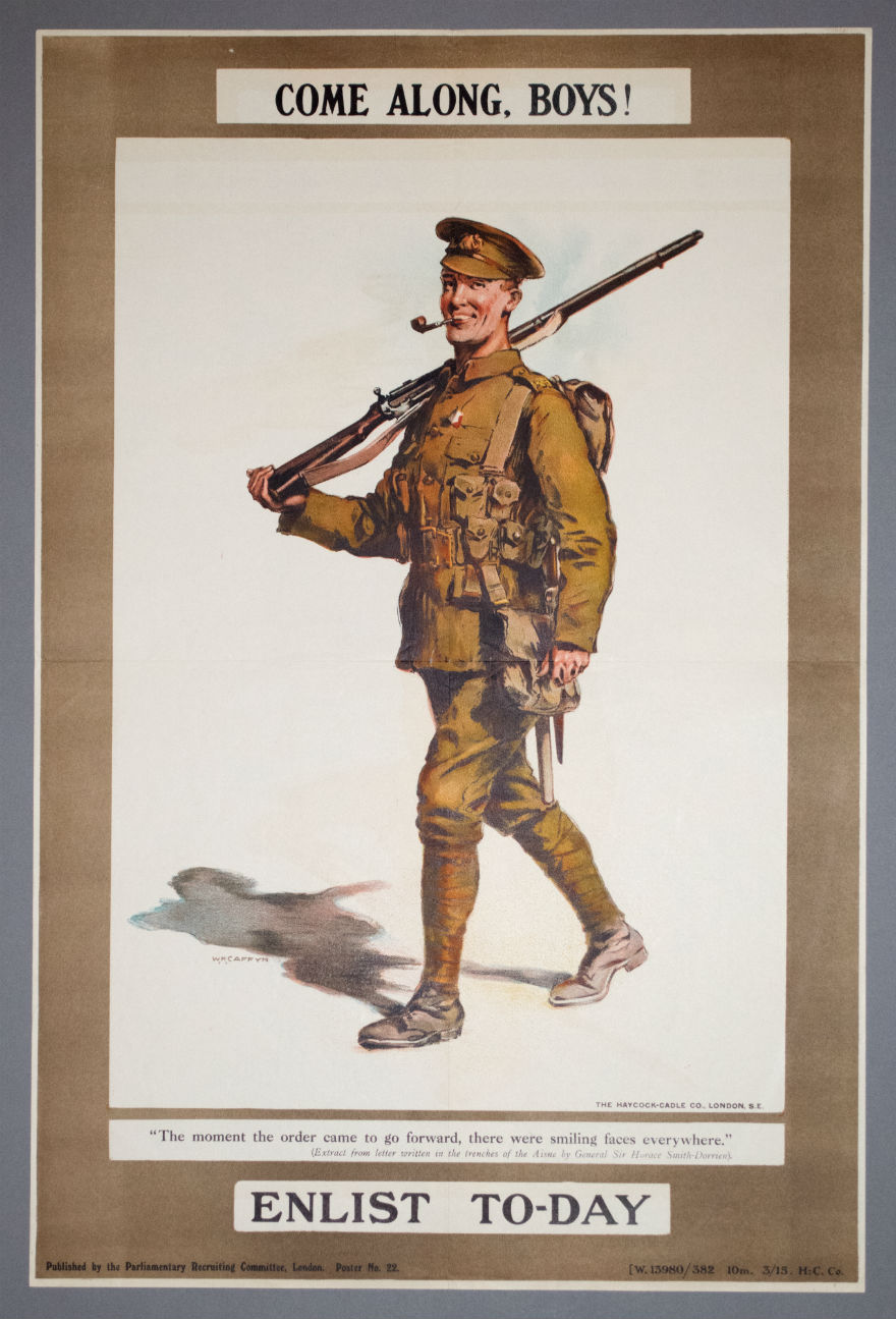Stories of the horrors of war and the desperate conditions of the trenches arrived back from the battlefields. Poster campaigns attempted to counteract this by communicating a positive spin on life in the army. An example of this approach is seen below. This poster features a happy smiling soldier, his cap at a jaunty angle, with the words ‘Come along boys! Enlist today!’