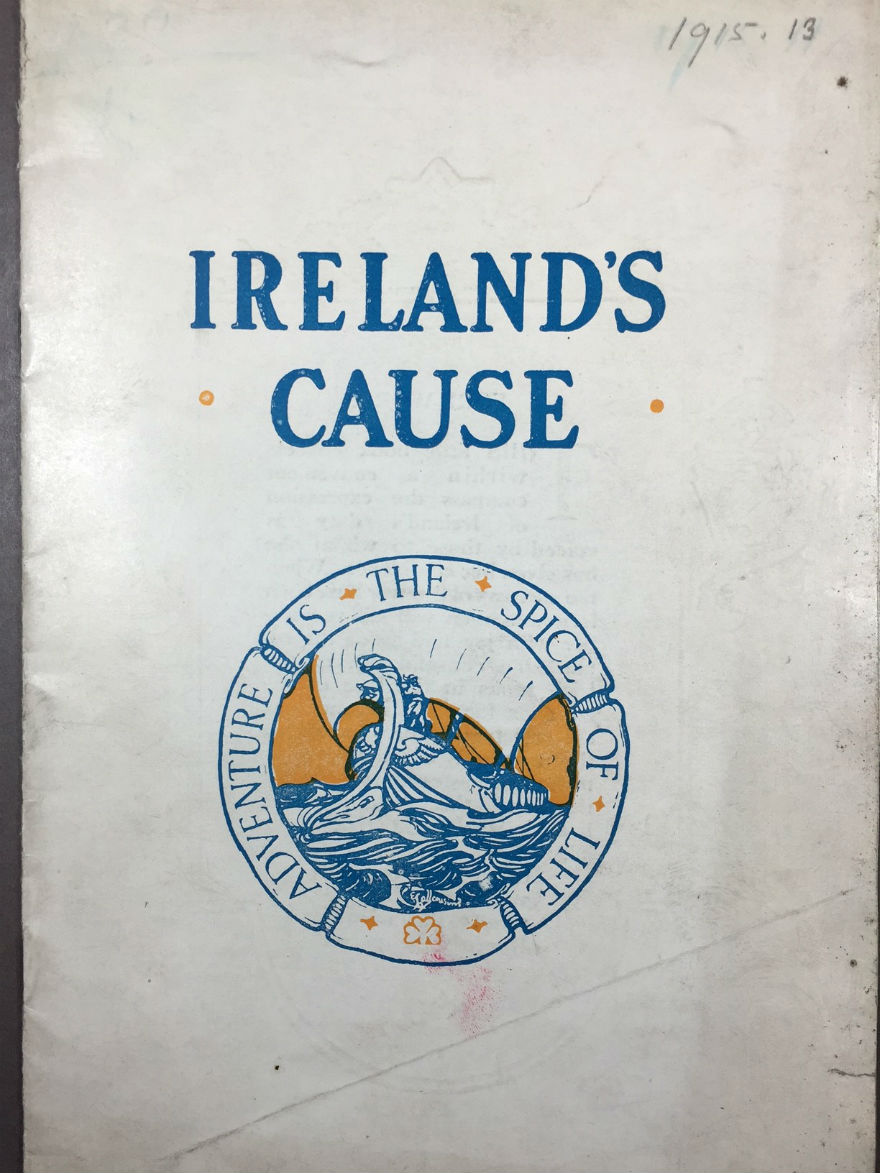 The idea of joining the army as an adventure is also seen in an interesting pamphlet I recently came across in our pamphlet collection. Entitled Ireland’s Cause it is printed in both English and Irish and was probably published by the Parliamentary Recruitment Committee. It portrays a positive, attractive view of the army life. It begins by telling the reader the first rule of the Army is to give every man three meals a day ‘it would be hard to beat the stews and pies which form the principle portion of Tommy’s daily menu.’ The pamphlet is illustrated with scenes of men playing football, fencing and boxing. It includes extracts from a speech given by Redmond who had recently visited the front: