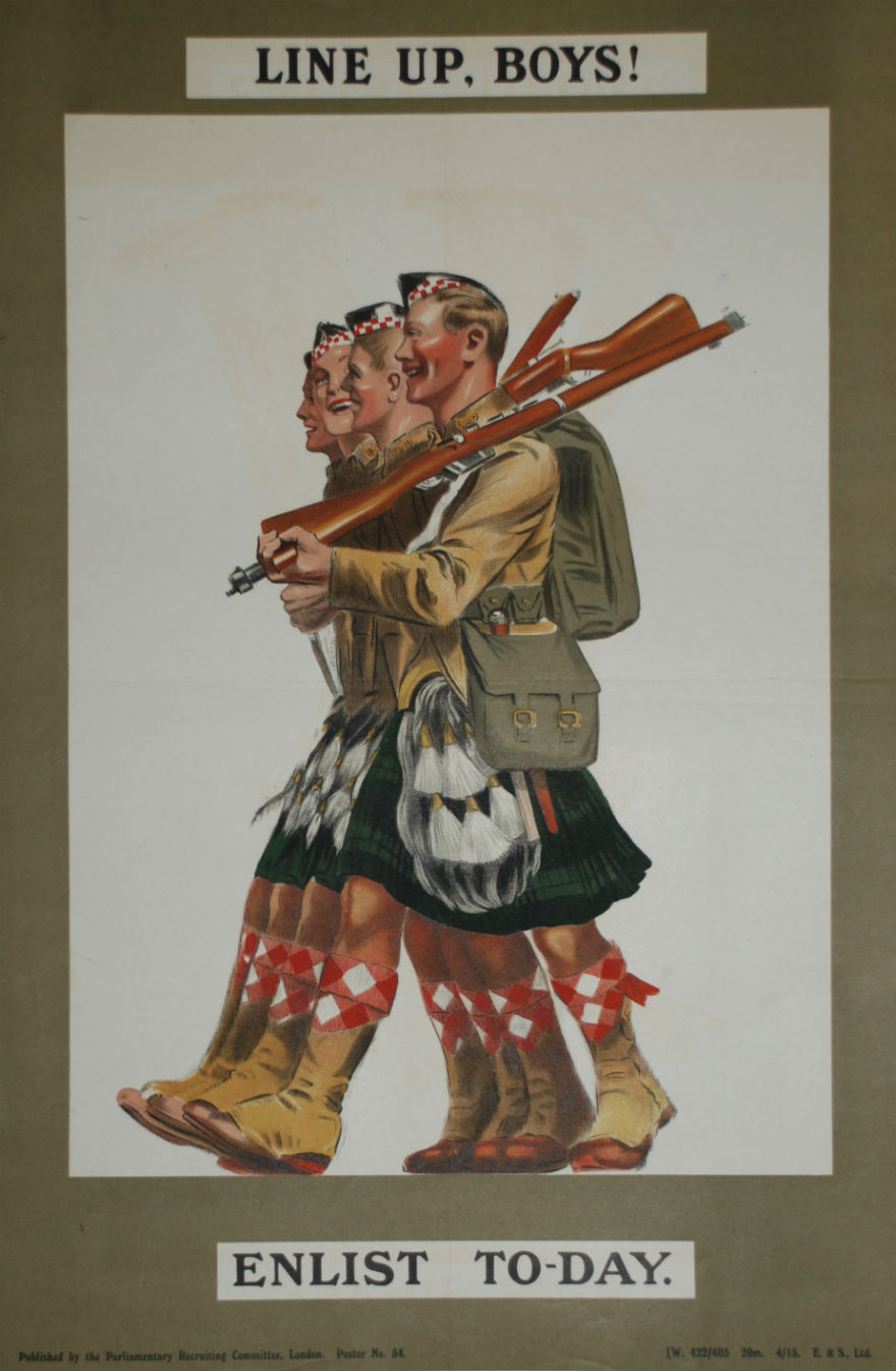 The poster below has the same sentiment, it depicts a group of Highland soldiers laughing and smiling as they march in unison. This image portrays happy soldiers and a sense of comradery and adventure – heading off for adventure with your pals.