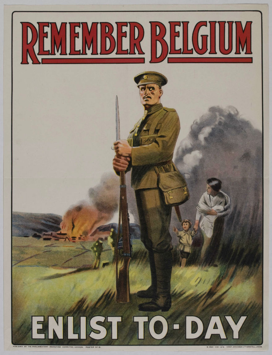 The poster below urges the viewer to ‘Remember Belgium.’ The German invasion of Belgium resulted in the deaths of over 6,000 civilians and was referred to as the ‘German atrocities’. The poster depicts a soldier standing in the foreground and a woman and child fleeing from a burning village in the background. What is the viewer being asked to do here – To stand up for what is right? To join the army to protect women and children? To be a man?