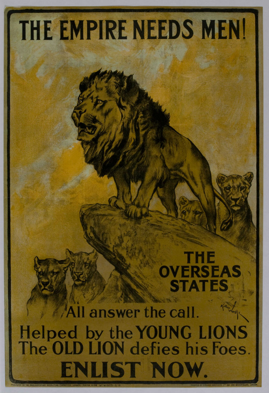 The artist Arthur Wardle used the imagery of a pride of lions with the text ‘The Empire needs men!’ This poster printed in 1915 addresses the Commonwealth stating ‘The overseas states all answer the call. Helped by the young lions the old lion defies his foes. Enlist now.’ Wardle mainly painted animal subjects and spent many hours sketching animals at London Zoo. In this image the old lion standing on the rock represents Britain and the young lions behind represent the countries of the Commonwealth.