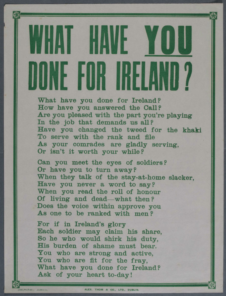 1 July 2016 marks the 100th anniversary of the start of one of the worst battles in military history. The Battle of the Somme lasted 141 days and claimed over a million casualties, including c.3,500 Irishmen. The First World War (WWI) raged on for another two years with the final death toll exceeding 38 million. Ireland’s Memorial Records, a Roll of Honour listing the names of Irishmen killed in WWI, runs to eight volumes and contains 49,400 names. There was no Conscription in Ireland, yet 140,000 Irishmen enlisted between 1914 and 1918. What propelled men to join up? What means did the British Government use to encourage men to take up arms and face an uncertain future in the battle fields?