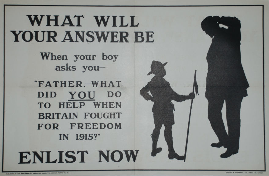 The poster below shows a figure of a young boy in a scout’s uniform looking up at his father with the question ‘Father – what did you do to help Britain fight for freedom in 1915?’ In this poster the viewer is forced to look at his sense of duty, his role as a father and a man – how he will be seen by others particularly his son. Another version of this poster was published for the Irish market, with ‘Ireland’ substituted for ‘Britain’ in the text.[iv]