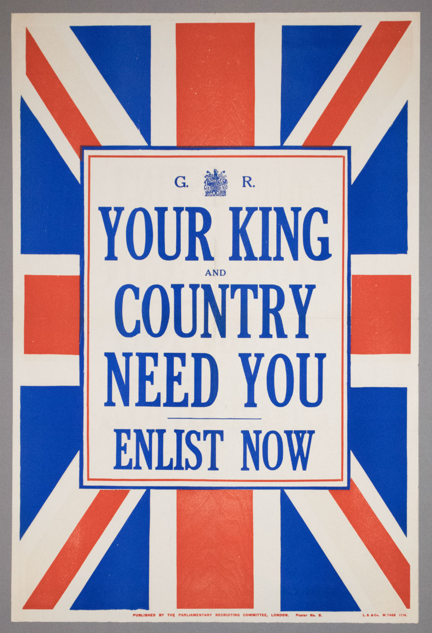 So, what methods did the posters use to encourage recruitment? One of the earliest posters in the Academy collection was printed in November 1914 by The Parliamentary Recruiting Committee, London. This poster is worth mentioning as it became the basis of other well-known recruitment posters. In July 1914 Eric Field of the Caxton Advertising Agency was approached by high ranking governmental officials and sworn to secrecy, he was told that war was imminent and was contracted to design a visual recruitment strategy. Field created a concept in red, white and blue with the Coat of Arms of George V and the words ‘Your King and Country Need you.’ On 5 August 1914, the day after war was declared, a version of this advertisement appeared in a number of newspapers and was printed as an official poster.