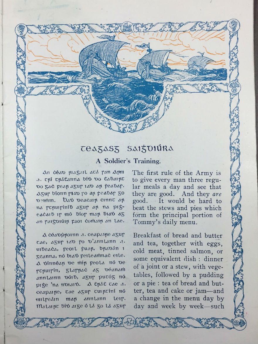 According to a small article in the Waterford News from 1916, this bilingual pamphlet was sent out to all households in Waterford. The author of the article (‘Gossip by a Gaelic Leaguer: Irish for Recruits’) seems unconvinced by its content: