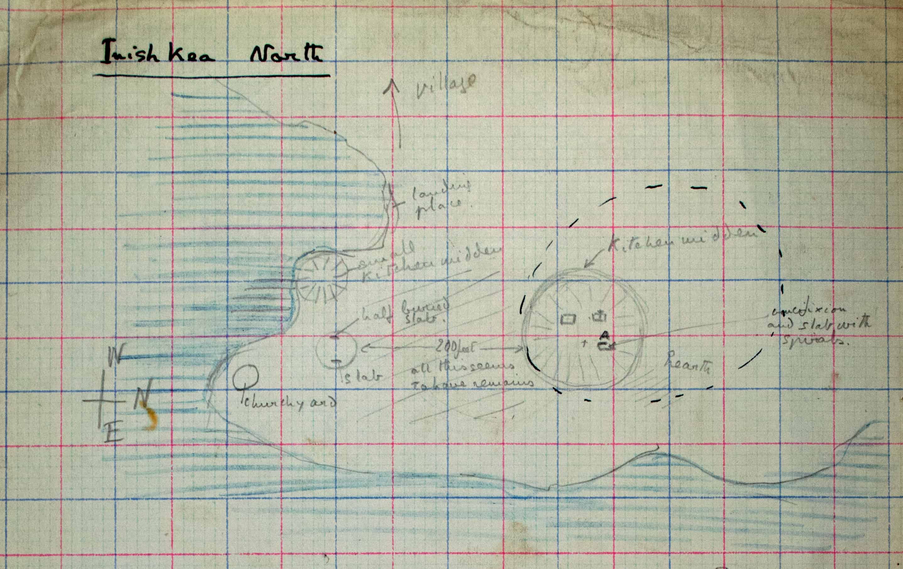 Françoise Henry’s map of a part of Inishkea North, Co. Mayo, marking various items of archaeological interest on the island (RIA)
