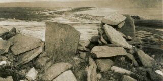 Excavations in progress on Inishkea North, Co. Mayo, with workmen clearing sand around the stele in the foreground before Françoise Henry had it transported to the National Museum in Dublin in 1938. The stone in the background is still in situ. (RIA)