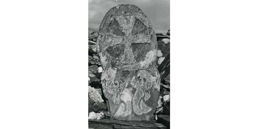 Main image above: The Crucifixion slab on the Bailey Mór of Inishkea North before Françoise Henry’s excavation revealed the whole stone – one of County Mayo’s major contributions to the art of early medieval Ireland (RIA)