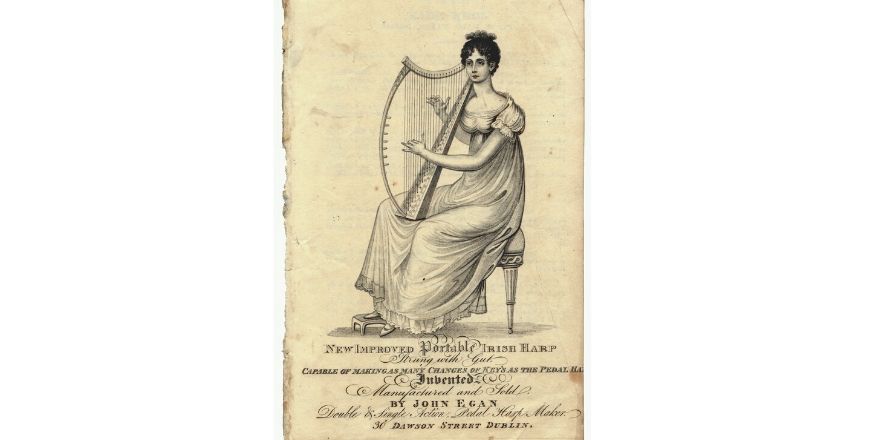 This debut of Egan’s Irish harp on 17 October 1821 was part of Moore’s busy final day in Dublin, along with sitting for a portrait, shopping for a tabbinet (cloth) for Bessy and dining in Howth that evening prior to his return journey to England.[1] The harp maker John Egan (fl.1797-1829) had written to Moore months earlier on the ‘perfection’ of his new harp model and according to Moore, ‘begging me to allow him to present me one of his best, as a mark of admiration.’[2] An Irish harp placed in the hands of the Bard of Erin, this celebrated performer in London drawing-rooms, was a case of masterful product placement by Egan. Mutually advantageous to Moore, it was the perfect accessory for the national bard’s public persona, singing his harp-infused lyrics of the Irish Melodies to the chords of the national instrument.