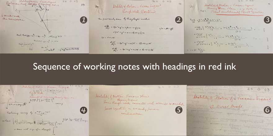 Fig.3 Headings from working notes from beginning (1) to the creation of a first draft (6) with title Stability of motion of a viscous liquid
