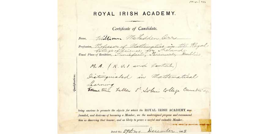 McFadden Orr graduated in mathematics at age nineteen from the Royal University of Ireland. He attended St John’s College Cambridge and in 1888 became Senior Wrangler followed by a fellowship. In 1892 he was appointed Professor of Mathematics in the Royal College of Science for Ireland and transferred in 1926 to University College Dublin. On 29 December 1903 McFadden Orr was proposed for membership of the RIA and duly elected as of 16 March 1904. He was elected to the Royal Society in 1909 and received an honorary DSc from Queen’s University Belfast in 1919. Unfortunately, he died within a year of retirement in 1933 at age 68.
