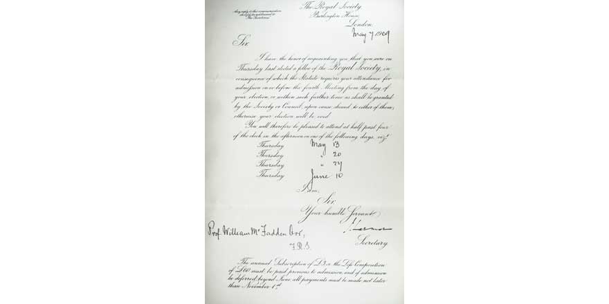 Fortunately, the McFadden Orr Archives contain the original document from the Royal Society awarding him the Fellowship of the Royal Society (FRS) title. It is in good condition but has been folded to fit into a box with the other notes and letters.