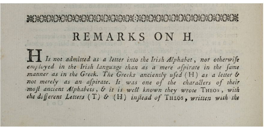 O’Brien’s remarks on the letter H from Focalóir Gaoidhilge-Sax-Bhéarla (Paris, 1768)