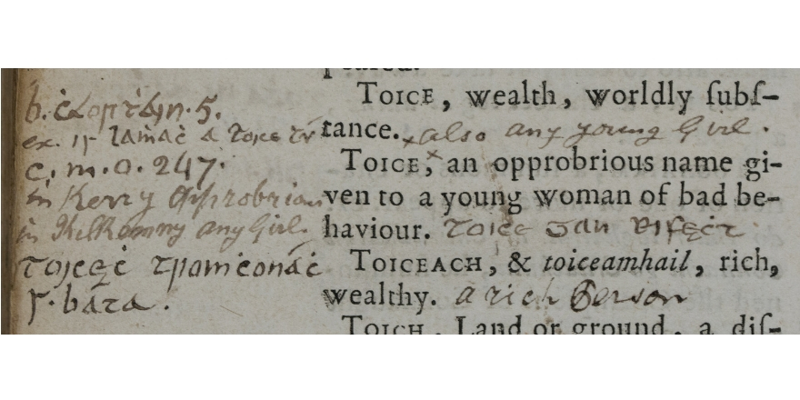As seen below, where O’Brien has ‘TOICE, an opprobrious name given to a young woman of bad behaviour’, Ó Súillleabháin, while he acknowledges that it appears with that meaning in Merriman’s Cúirt an Mheadhon-Oidhche/Midnight Court, notices a nuance of dialect and feels the need to add the clarification ‘in Kerry opprobrious, in Kilkenny any girl.’ The later Irish lexicographer Dinneen is in agreement with Ó Súilleabháin, as he instructs us the word ‘toice’ can be ‘either affectionate or contemptuous’.[ii]