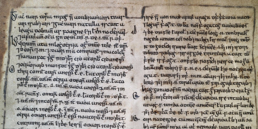 The format in which these legal manuscripts were transcribed was quite complex. They often consisted of an early ‘text’ written in large script, believed to preserve elements of Irish law that originated in the seventh or eighth centuries. Surrounding that text, in smaller script, were explanatory glosses and commentaries. These later interpretative elements had accumulated in the law schools over several centuries.