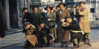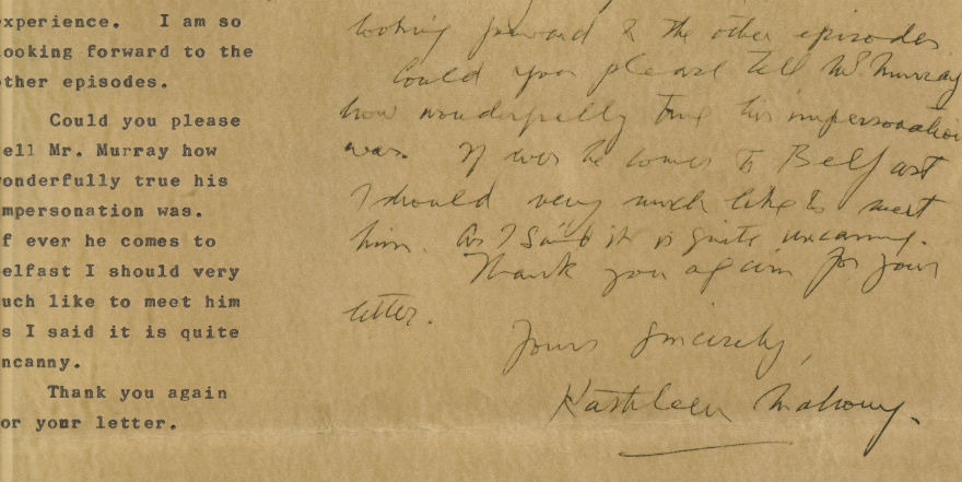 Once Insurrection was broadcast some relatives of the Easter Rising participants wrote to RTÉ with their comments. Kathleen Mahony, the widow of the aforementioned Lieutenant George Mahony, wrote after the first episode to note how she, her daughters and her son-in-law were “enthralled” to see her husband portrayed on the programme, commenting on how the actor playing her late husband is very like him in looks and mannerisms – “Could you please tell Mr. Murray how wonderfully true his impersonation was?”[7] She wrote once more after the final episode to correct the fallacy that her husband was English, noting that he was born in Cork and “entirely Irish”[8].