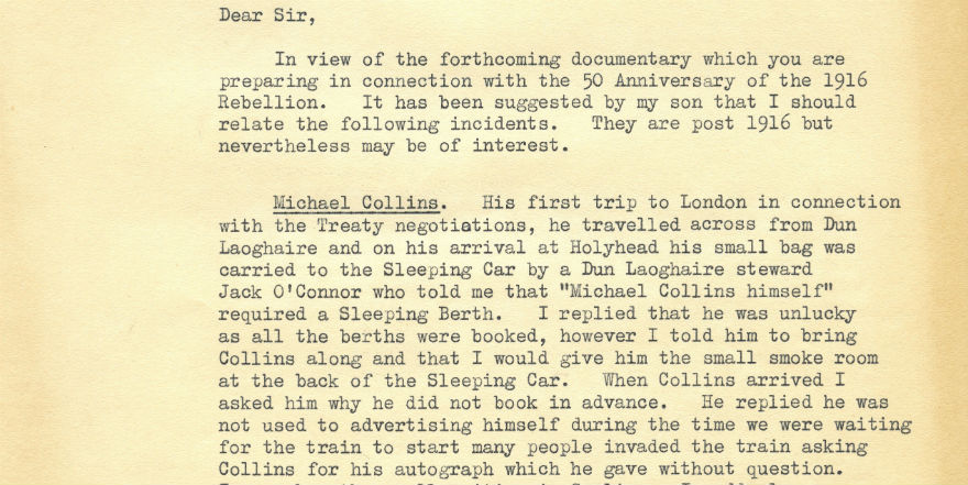 Members of the public were particularly interested in the planned programming and many sent letters to RTÉ suggesting possible topics and interviewees. Some wrote to RTÉ telling their own or their family’s stories from the Rising. One particularly interesting letter, from a William C. Sweeney of Greenwich, recounts two stories from his time working on the boats from Holyhead to Dublin.[6] One of his stories concerns Michael Collins travelling to London for treaty negotiations in 1921 when Mr. Alfred Cope, Assistant Under-Secretary for Ireland, happened to be travelling on the same ferry. Sweeney recounts how Cope had his armed guard vacate his sleeping berth in order to give it to Collins who had been too late in booking to secure one. The other story concerns executioner John Ellis travelling to Ireland to execute Kevin Barry.