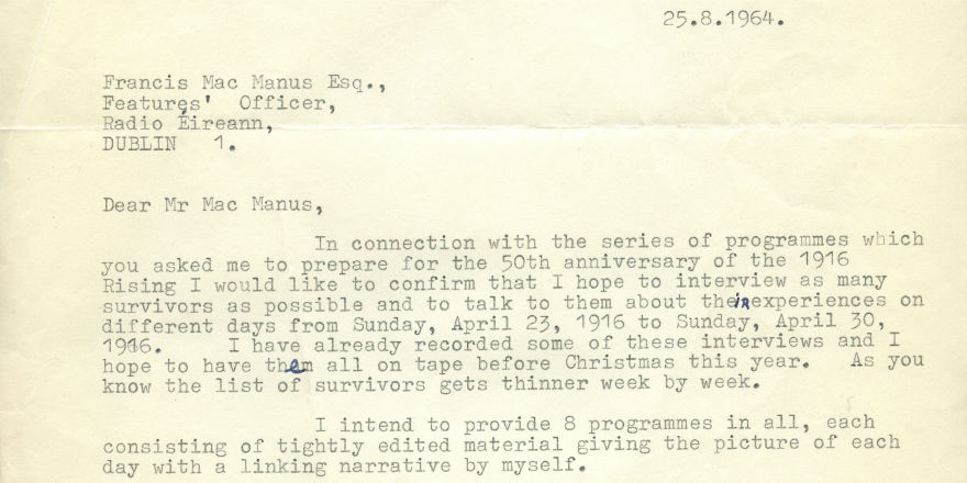 The planning for the commemorative programming had begun as early as 1963 when Francis MacManus, General Features Officer at RTÉ Raidió Éireann commissioned a series of radio interviews with survivors of the Rising. Proinsias MacAonghusa undertook the interviews, noting in a letter to MacManus “As you know, the list of survivors gets thinner week by week”[1].
