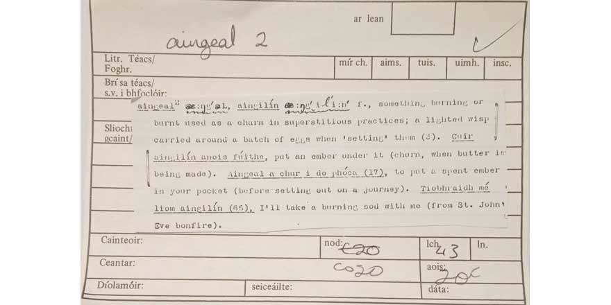‘smeachóid dhearg le cur faoin gcuinneog le linn maistridh … sop lasta le cur timpeall ar ál uibheacha á gcur síos’. Dála aingeal Uí Chadhain, cleachtais phiseogacha iad seo leis an im agus na huibheacha a thabhairt slán. Tá tuilleadh ar shlip a chuir de Bhaldraithe le chéile d’Fhoclóir Stairiúil an Acadaimh. Aingeal, aingilín an ceannfhocal agus an míniú seo leis i dtosach: ‘something burning or burnt used as a charm in superstitious practices.’ Sop nó fód lasta ó thine Oíche Fhéile Eoin atá i gceist, aibhleog bheo nó mhúchta.