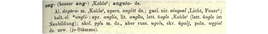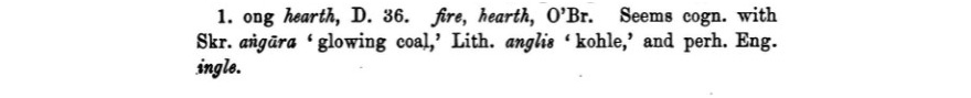 Ní mór a rá go bhfuil an t-ainmfhocal ong in eDIL agus tine nó teallach an chiall atá luaite leis; sampla amháin atá ann ó ghluaiseanna meánaoise áit a bhfuil nóta ag maíomh gur dócha go bhfuil sé gaolta le focal Sanscraite aṅgāra ‘gual’. Ina fhoclóir sanasaíochta Ind-Eorpaise, Indogermanisches etymologisches Wörterbuch, a foilsíodh in 1959, tá tuilleadh eolais ag Julius Pokorny faoin iontráil ong/angelo- ‘gual’ agus nascann sé an focal sin le aingeal na Gaeilge agus le focail eile i roinnt teangacha Baltach-Slavacha.