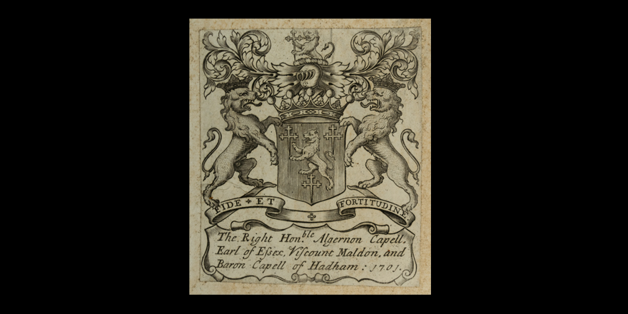 Bookplate of Algernon Capel, 2nd earl of Essex, from the RIA volumes, which had been commissioned by his father.