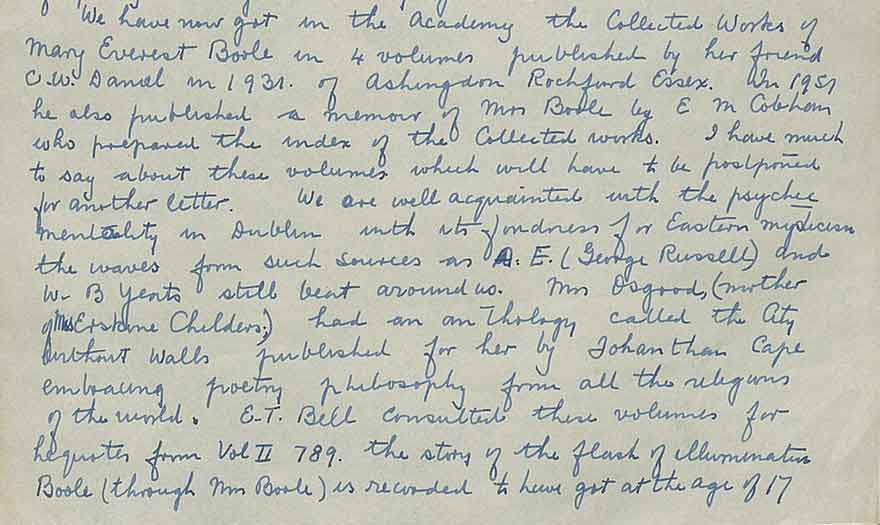 The 4 volumes of the Collected Works of Mary Everest Boole published in 1931 by C. W. Daniel, now in the Academy, has greatly interested Hackett “We are well acquainted with the psychic mentality in Dublin with its fondness for Eastern mysticism the waves from such sources as A. E. (George Russell) and W. B. Yeats still beat around us”.