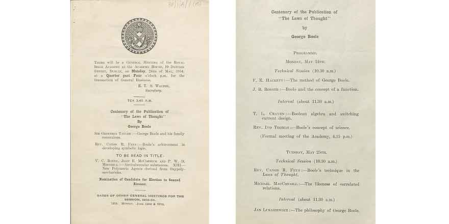 You see 2015 wasn’t the only time an Irish institution was to mark the achievements of George Boole. In 1953 Felix Hackett was convener of the organising committee established by the RIA, to mark in 1954 the 100th anniversary of the publication of Boole’s The Laws of Thought. Hackett was a retired Professor of Physics and Electrical Engineering, University College, Dublin.