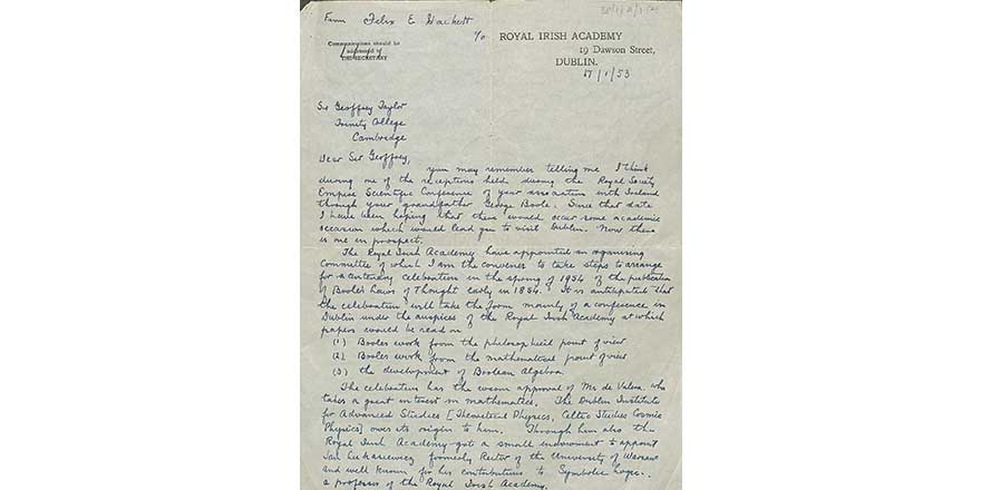 Hackett explains to Taylor that it has fallen to the Academy to mark the centenary as “there is no traditional feeling linking the U.C.C. of today with Q.C.C. of a century ago”. Boole was a member of the Academy and Professor Jan Lukasiewicz (Professor of Mathematical Logic, RIA) recognised the important contribution of Boole to symbolic logic with the publication of The Laws of Thought in 1854 and wanted to honour Boole with a celebration by the Academy involving Boole’s family.