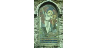 Ethel Rhind was a key artist in the Irish arts and crafts movement of the early twentieth century. A member of Sarah Purser’s stained-glass workshop An Túr Glaoine – she worked both in stained glass and opus sectile (the setting of a mosaic of flat glass pieces into plaster), a craft at which she excelled. Rhind’s stained glass and opus sectile works are featured in churches all over Ireland including St Enda’s Church, Spiddal, Co. Galway; Dun Laoghaire Presbyterian Church, Dublin; the Franciscan Friary, Athlone and the Honan Chapel in UCC. Her work can also be found in the US. Ethel Rhind’s opus sectile memorial World War 1 memorial ‘Archangel Michael’ (1921) is featured on the exterior wall of All Saints’ Church, Grangegorman. Read more about Ethel and her work here.