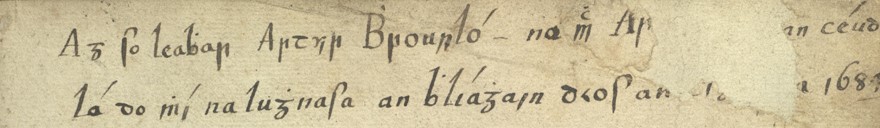 ‘Ag so leabhar Artuir Bhrounló nó Mach Ar[tuir] an céud lá do mhí na Lughnasa an bhliaghain … 1689’.
