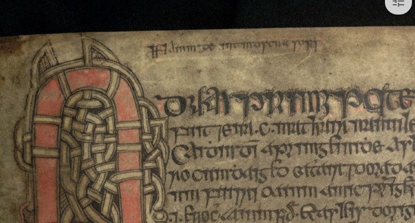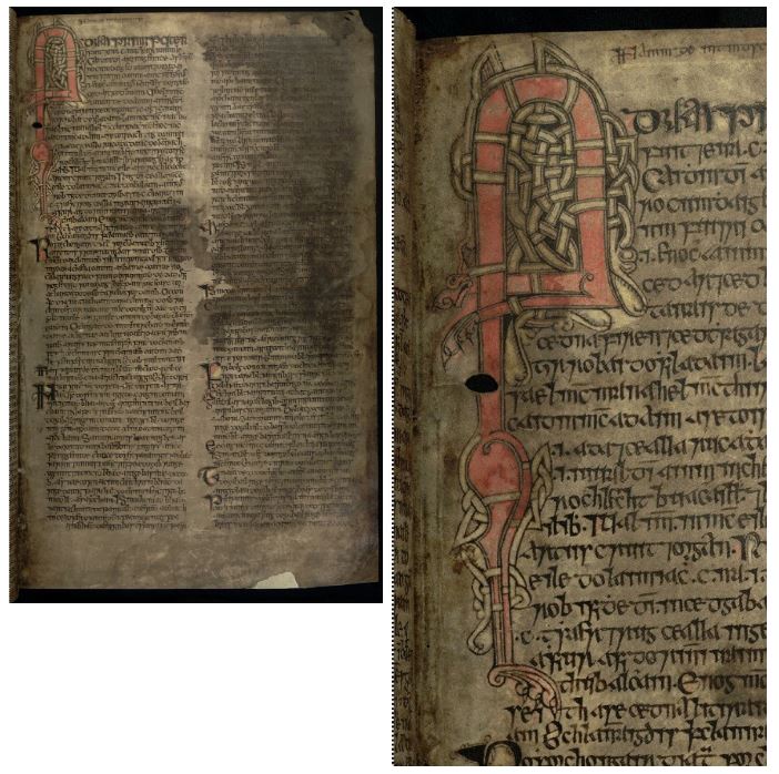 [Fig. 2 – Book of Ui Mhaine (RIA MS D ii 1) f.48r.] [Fig. 3 – Detail of the decorated initial on f.48r.]