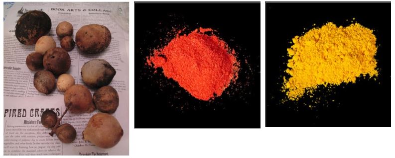 [Fig. 5 – Oak galls to make into iron gall-ink.][Fig. 6 – Vermillion pigment.][Fig. 7 – Orpiment pigment.]