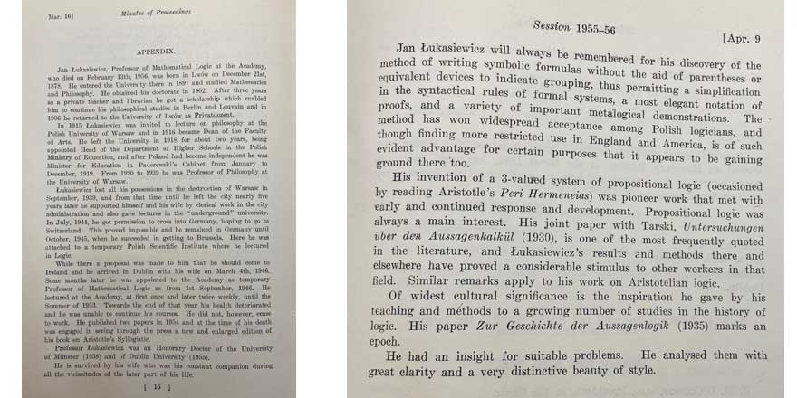 His appointment as a Professor in the Royal Irish Academy was highly unusual, though not without precedent again at the behest of Eamon de Valera, the Academy had appointed Erwin Schrödinger as a Professor of theoretical physics in 1940, if only for six months while the Dublin Institute of Advanced Studies was being set up. As far as I can ascertain, apart from Schrödinger and Łukasiewicz only two other people have ever been appointed as Professors of the Academy: Gerhard Besu and Ernst Lewy.