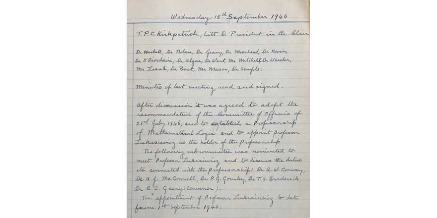 Fig.2 Royal Irish Academy council minutes from 18 September 1946 recording the appointment of Łukasiewicz to the Professorship of Mathematical Logic
