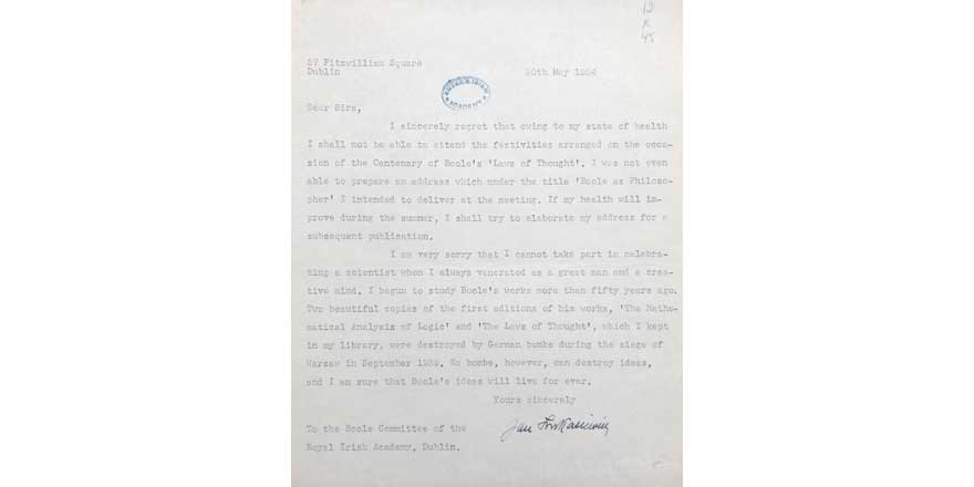 It’s always a thrill to reconstruct a person’s life, especially one so influential in such varied fields of academic study, and whose work paved the way for intellectual and technological innovations that are fundamental to the way that we live today. An appreciation published in the Proceedings of the Royal Irish Academy after his death neatly encapsulated his career: ‘His [work] … marks a turning point in the history of logic … His analyses of essential logical problems are distinguished by great clarity and extraordinary beauty of style.’