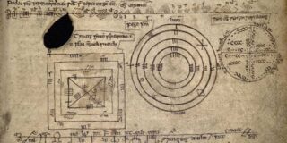 Some of the variant versions of the ogam alphabet found in In Lebor Ogaim allude to legendary Irish figures or aspects of wider literary tradition. For example, the diagram to the far left at the bottom of fol. 170r in the Book of Ballymote (above left and enlarged in the image below) illustrates a variety of the script called Traigsruth Ferchertne (‘Ferchertne’s Foot-stream?’), perhaps alluding to the acclaimed chief poet of Ulster who appears in literary sources from around the ninth century. The middle diagram is named Fege Find (‘Finn’s Ridge-pole [Ogam]’), most likely referring to the famous Irish warrior Fionn Mac Cumhaill, while the diagram to the right is named Rothogam Roigni Roscadhaigh (‘Wheel-ogam of Roigne Roscadach’), possibly an allusion to a figure skilled in poetry or rhetorical speech (roscad). In these varieties of the script, the ogam symbols are arranged in a wheel or on the lines of concentric circles or squares: