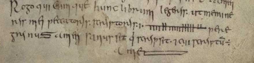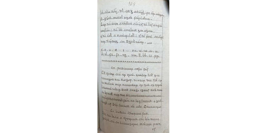 The first signature in the above image is in traditional ogam script, while the second is in so-called ‘ogam coll’, a cipher in conventional script in which vowels (which would be represented by one to five strokes in traditional ogam) are instead written with one to five cs. This code appears to derive from one of the variants of ogam referred to in In Lebor Ogaim as coll ar guta (‘C for a vowel’). The third signature is in so-called ‘ogam consaine’, another cipher in conventional script whereby vowels and diphthongs are replaced by certain combinations of consonants. In accordance with a key to this latter cipher given on the preceding page of the manuscript, the ‘í’ in Mícheál’s forename is represented by the letters NG, while the diphthong EA is replaced by the doubled consonant MM.