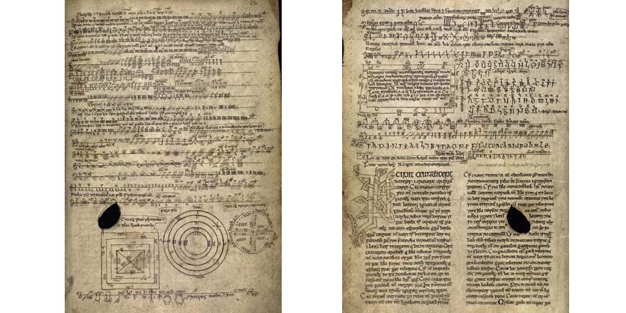 In some cases, the use of ogam script seems to have offered momentary amusement or distraction for a scribe tasked with copying learned (and perhaps rather tedious or technical) material. An example of this is found in RIA MS 24 B 3, an early-sixteenth-century compilation of medical learning written by the North Connacht scribe Conla Mac an Leagha, who appears to have been a practising surgeon in the service of the Mac Diarmada lords in Magh Luirg (modern Boyle and Frenchpark, Co. Roscommon). When copying an Irish translation of standard Latin teaching on uroscopy (the diagnosis of illness through examination of urine), Conla lent an additional Irish flavour to his work by occasionally switching from Roman to ogam script: