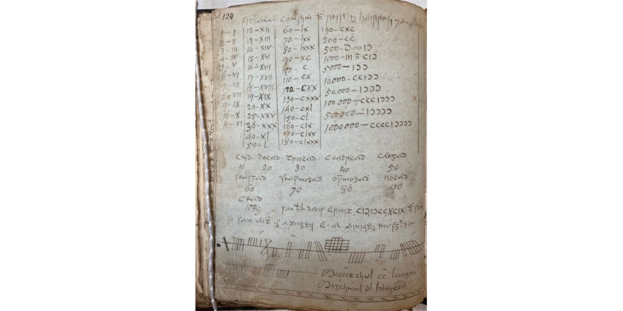 Ogam script, or variants of it, continued to be used in Irish manuscripts well into the modern period. Numerous examples of the writing system are found in handwritten books of Irish-language prose and poetry produced during the eighteenth and nineteenth centuries, many of them associated with members of the prolific Ó Longáin family of scribes. Thus in RIA MS 493 (23 C 18), a miscellaneous collection of Irish lore, Mícheál Óg Ó Longáin (1766–1837) signed his name three times at the bottom of a page containing a list of Arabic and Roman numerals: