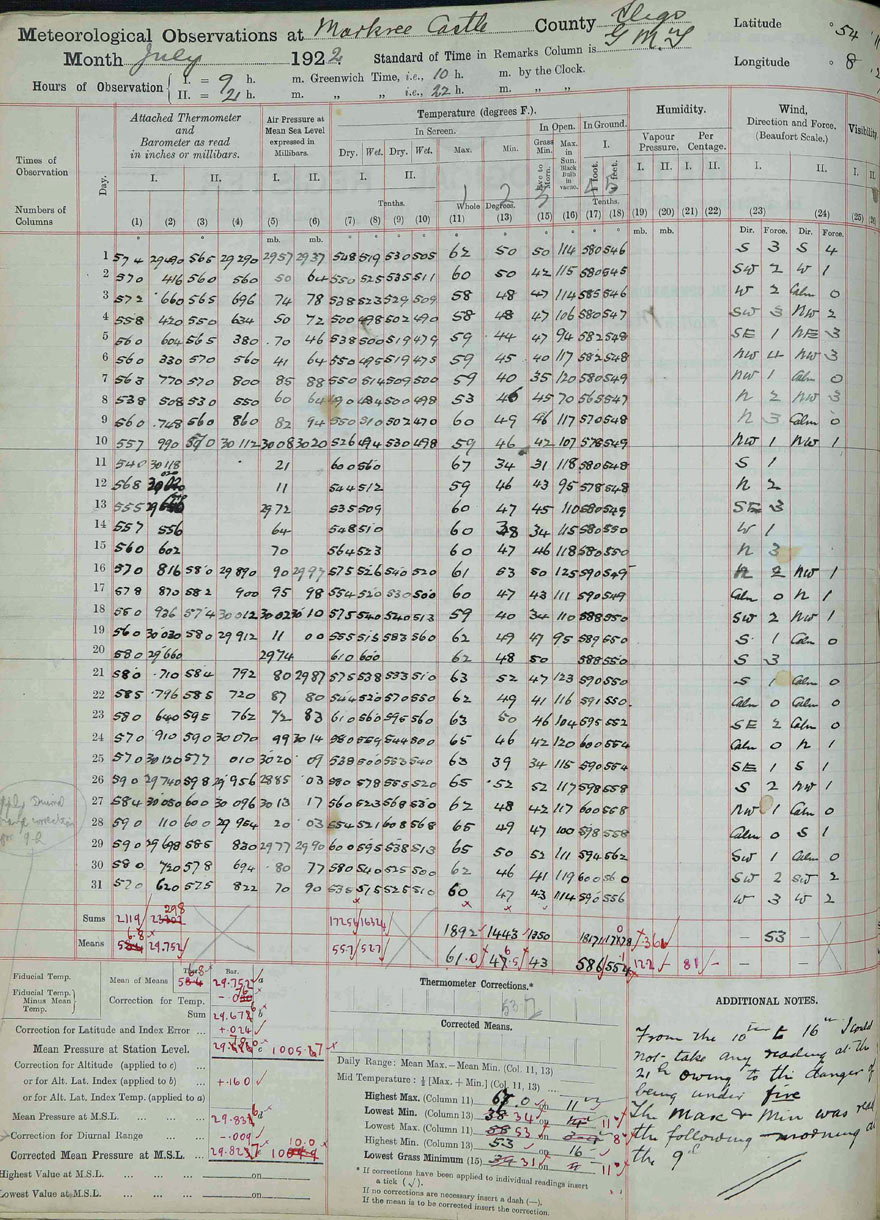 Weather data recorded at Markree Castle, Co. Sligo, for July 1922