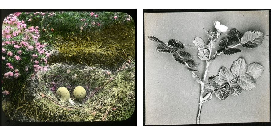 Fig.6 & 7 Two handmade lantern slides. The image of the nest has been hand-painted. The image on the right has a skewed appearance,