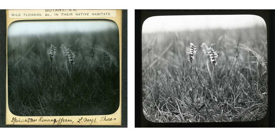 Fig.8 & 9 A lantern slide with an image produced by R. J. Welch. The image is of Spiranthes romanzoffiana, or ‘Irish Lady’s Tresses’. The handwritten inscription suggests that the slide was handmade. Note the same image on the right,
