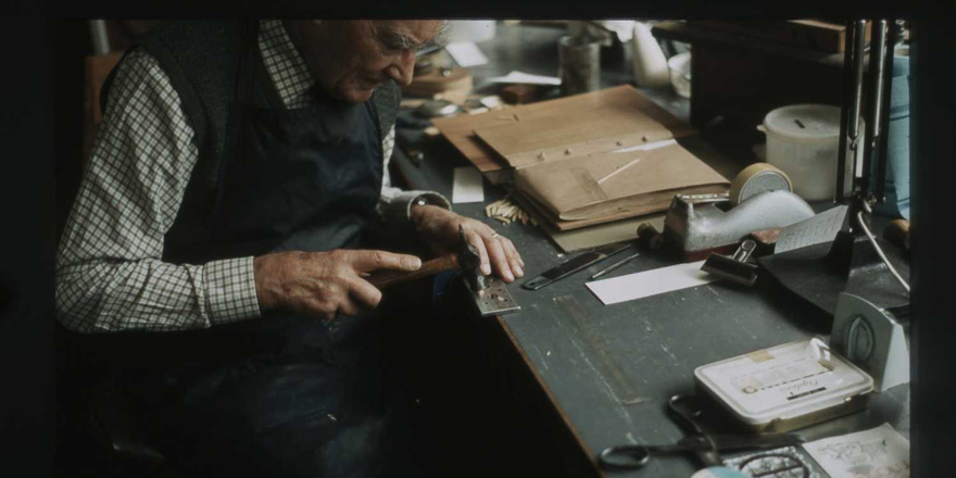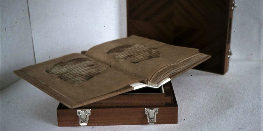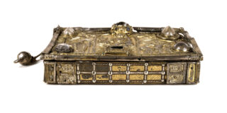 In 1980 more elaborate repair and rebinding work was carried out by Roger Powell and his assistant, Dorothy Cumpstey, at a cost of Stg£6,150 for the repair and Stg£250 for the case. The paper mounting, from which the vellum leaves had come adrift, was replaced by new vellum mounts specially stained to match the colour of the original leaves. Pieces of degreased fish skin were used for joining butted edges in the vellum mounts. The leaves, assembled in sections, were sewn within a zigzag of hand-made paper onto cords and bound in English oak boards. The spine was covered in white alum-tawed pigskin. To keep the vellum under pressure and to prevent cockling, the rebound manuscript was put into a special box designed by David Powell and made by George Taylor in Edward Barnsley’s workshop.