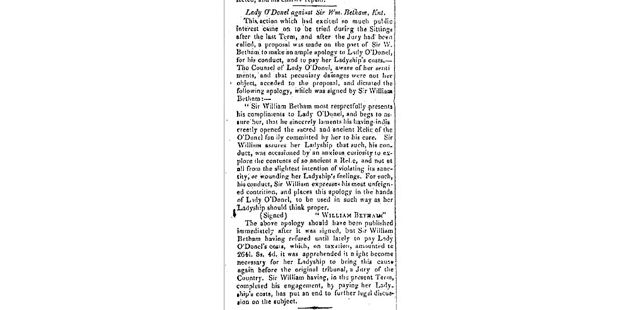“Sir William Betham most respectfully presents his compliments to Lady O’Donel, and begs to assure her, that he sincerely laments his having indiscreetly opened the sacred and ancient Relic of the O’Donel family committed by her to his care. Sir William assures her Ladyship that such, his conduct, was occasioned by an anxious curiosity to explore the contents of so ancient a relic, and not at all from the slightest intention of violating its sanctity, or wounding her Ladyship’s feelings. For such, his conduct, Sir William expresses his most unfeigned contrition, and places this apology in the hands of Lady O’Donel, to be used in such way as her Ladyship should think proper.