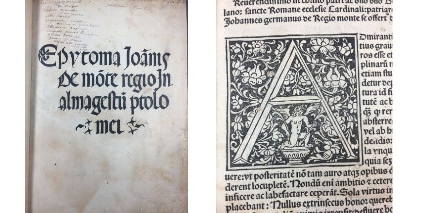 Xylographic title page and decorative initial. Epytoma Joannis de Monte Regio in Almagestum Ptolome by Joannes Regiomontanus (Venice, 1496) RIA SR 24 F 19.