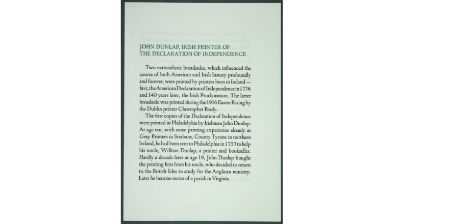 Some decades later Irish printers made their influence felt beyond the Isle. Research material is plentiful on Irishman John Dunlap, who printed America’s Declaration of Independence in Philadelphia in 1776, and on hundreds of other Irish printers who sailed to the young nation. Likewise, one can find great sources for the 300-year-old history of papermaking in Ireland. It’s interesting to note the variety of printing — for example, Ireland was the second country, in 1870, to print postcards. The Austro-Hungarian Empire was the first, a year earlier. The stories of Irish printing go on and on.
