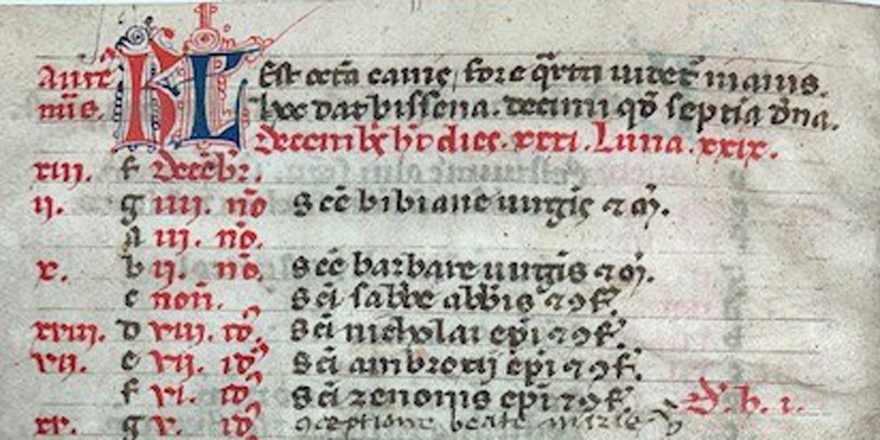 One of the most beautiful treasures in the RIA Library is MS 12 R 31, a highly illuminated medieval Book of Hours, for Sarum Use, produced in Rouen in the mid-15th century. The book features twenty-eight miniatures most of which were produced by the ‘Hoo Master’ with the exception of St Hildevert which was executed by the ‘Talbot Master’. In contrast, MS 12 R 35 is a late 14th century or early 15th century Augustinian missal of Italian provenance with considerably less decoration but with several brightly illustrated initial letters, pen-flourishing and rubrication throughout. These two medieval texts provide an opportunity for codicological analysis and comparison. Codicology is a holistic approach to the study of books and manuscripts and is concerned with describing the book as a physical object or artefact, considering attributes like binding, format, decoration, and illustration. This blog post will provide a brief codicological analysis of two medieval manuscripts in Academy collections.