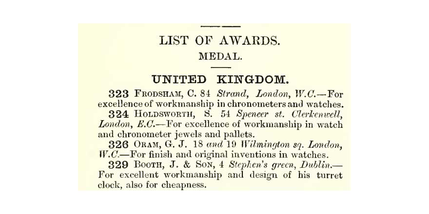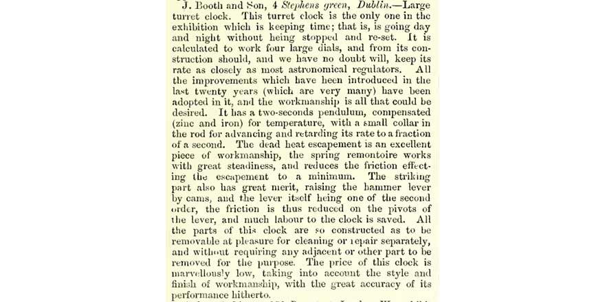 In 1865, J. Booth and Son participated at the great Dublin International Exhibition of Arts and Manufactures. Exhibition Palace was specifically-built to host the event at Earlsfort Terrace and nowadays is home to the National Concert Hall. The Illustrative record and descriptive catalogue of the Dublin International Exhibition of 1865 records the exhibitors and exhibits, awards, and medal winners. The clock entered by James Booth & Son won both a jury award and medal. The jury award notes that their clock was the only one still keeping time for the duration of the exhibition from May to November! The medal was awarded for ‘excellent workmanship and design of his turretclock, also for cheapness.’